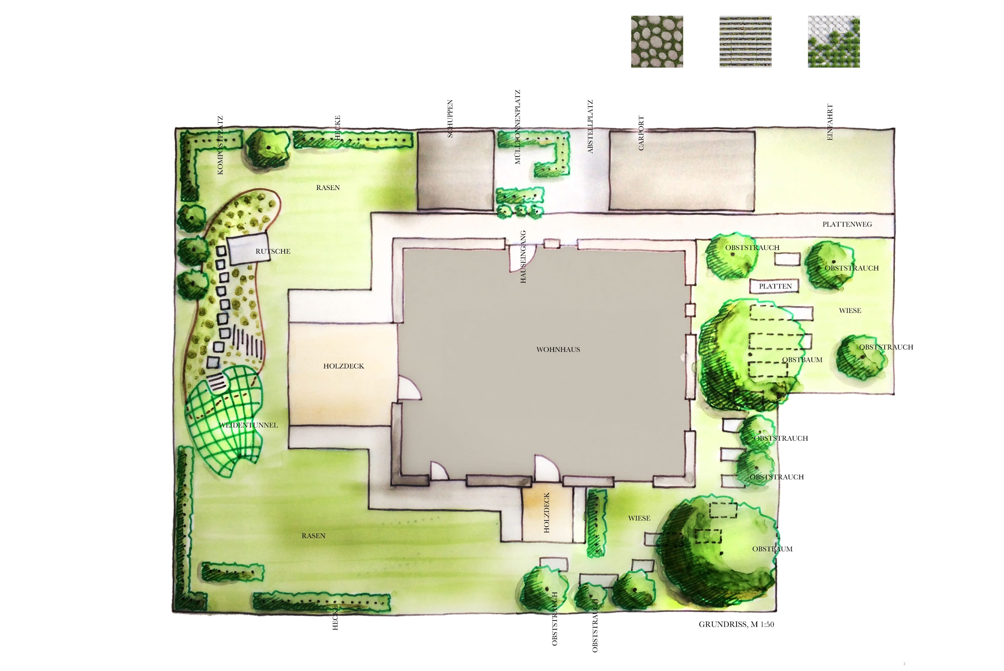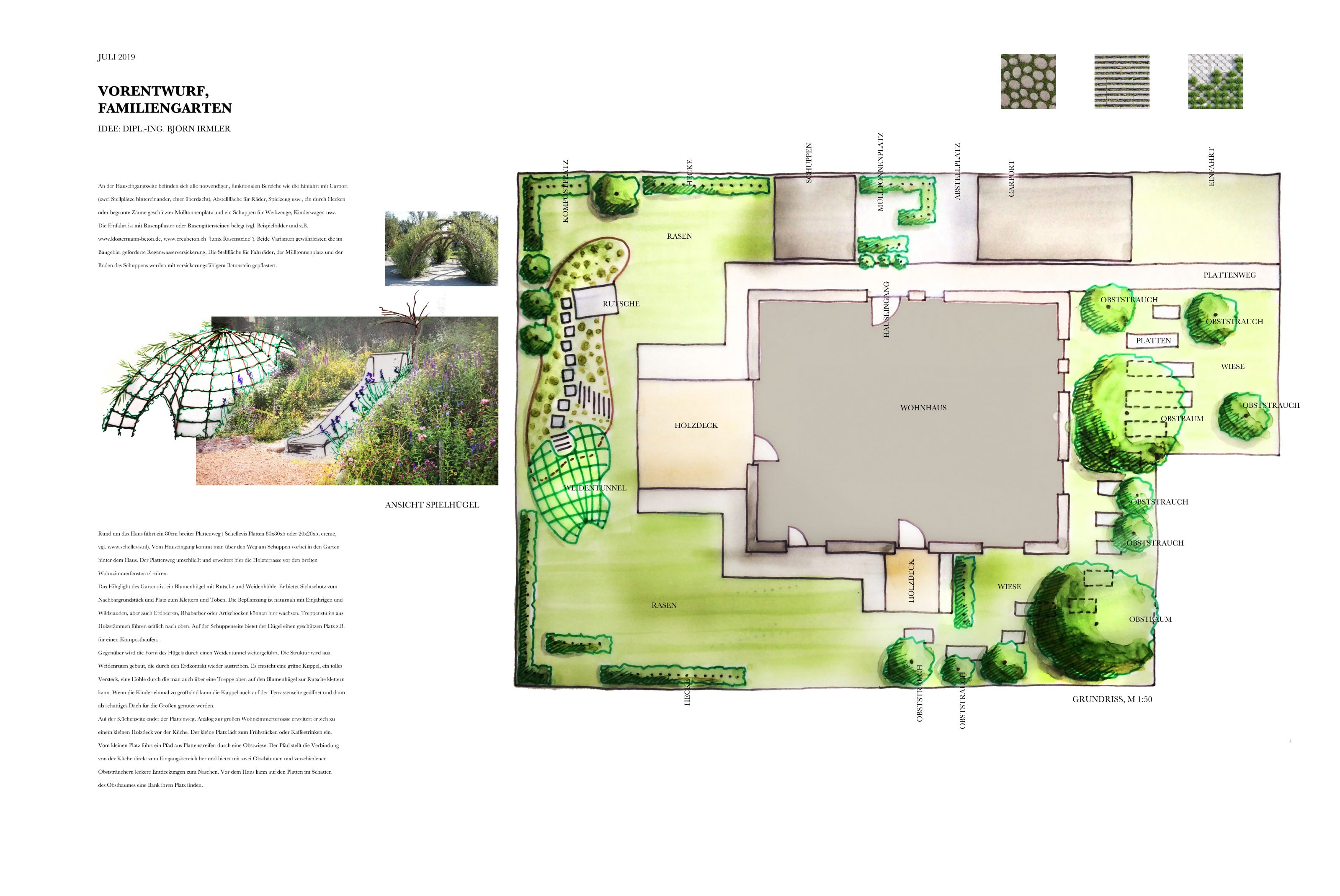 Das neugebaute Eigenheim soll einen familiengerechten Garten bekommen. Der Aushub des Hausfundamentes wird zu einem bepflanzten Spielhügel mit Rutsche und Weidentunnel. Dieser bietet Sichtschutz für die Terrasse und kann später geöffnet und zur Laube umfunktioniert werden. Es finden sich Rasen- und Wiesenflächen, Obstgehölze zum Naschen und natürlich die nötigen Nutzungen wie Parken und Mülltonnenbereich.