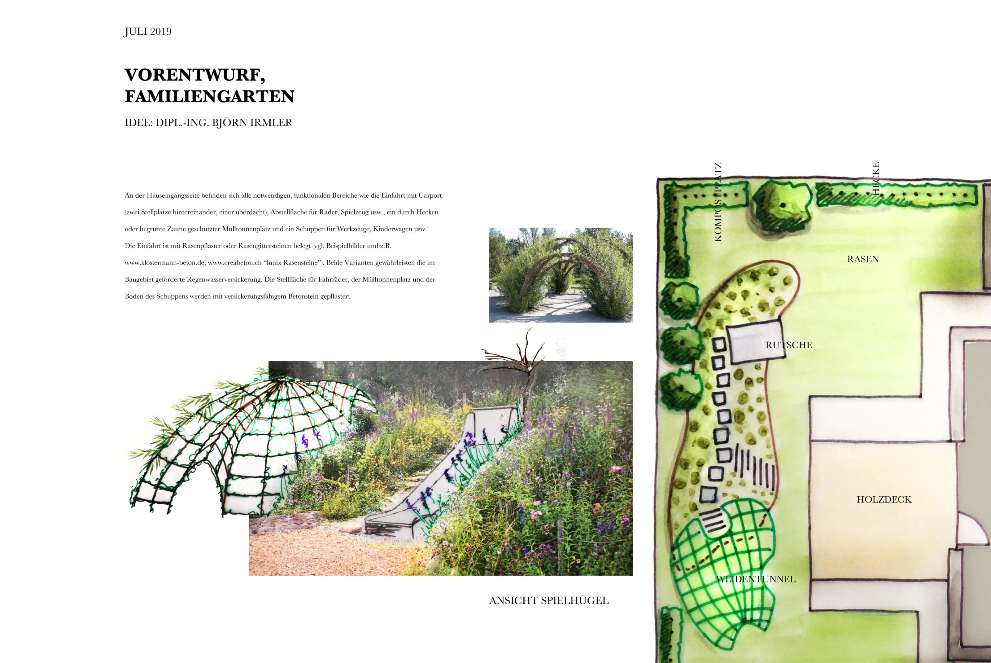 Das neugebaute Eigenheim soll einen familiengerechten Garten bekommen. Der Aushub des Hausfundamentes wird zu einem bepflanzten Spielhügel mit Rutsche und Weidentunnel. Dieser bietet Sichtschutz für die Terrasse und kann später geöffnet und zur Laube umfunktioniert werden. Es finden sich Rasen- und Wiesenflächen, Obstgehölze zum Naschen und natürlich die nötigen Nutzungen wie Parken und Mülltonnenbereich.