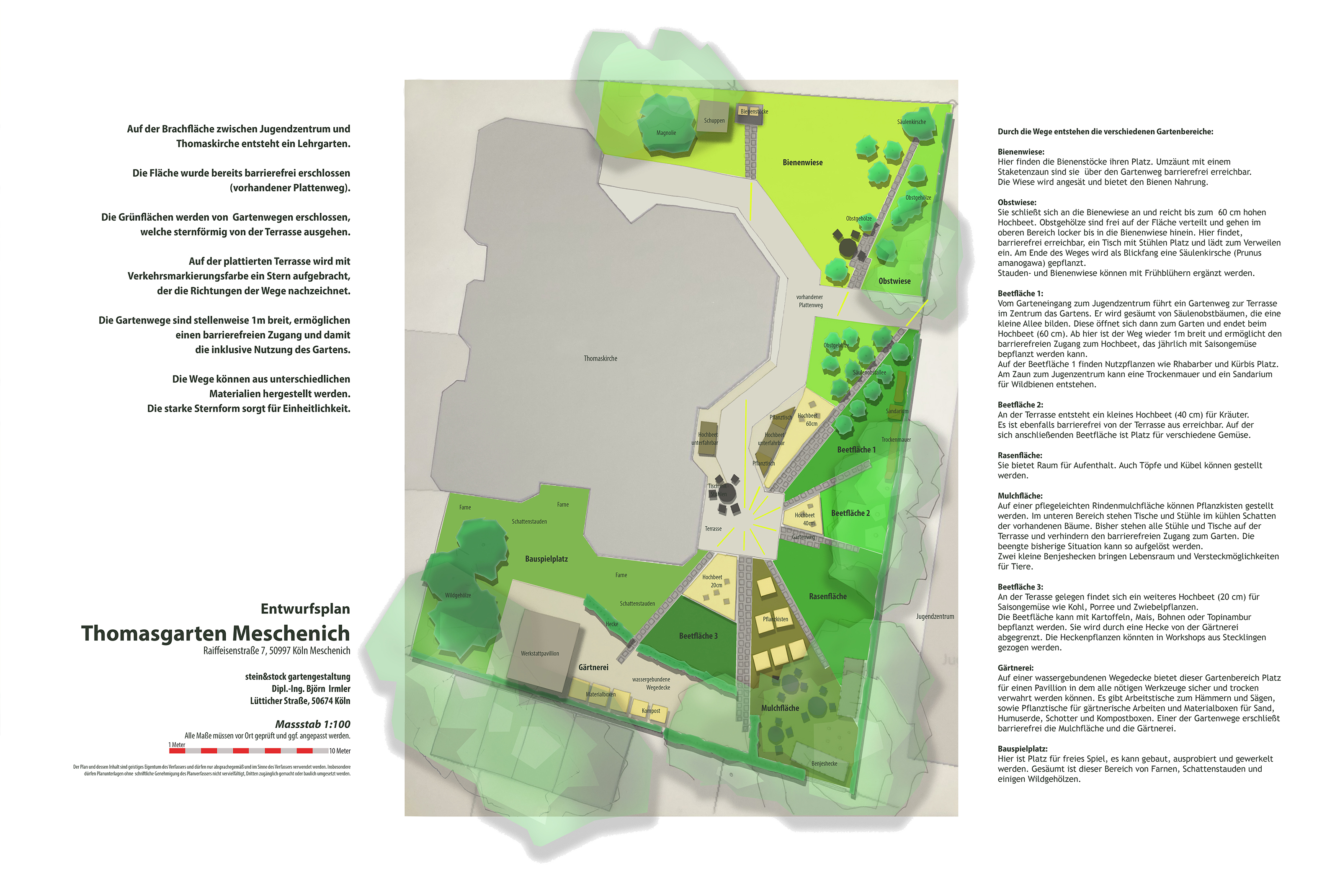Auf der Brachfläche zwischen Jugendzentrum und Thomaskirche entsteht ein Lehrgarten. Die Fläche wurde bereits barrierefrei erschlossen (vorhandener Plattenweg). Die Grünflächen werden von Gartenwegen erschlossen, welche sternförmig von der Terrasse ausgehen. Auf der plattierten Terrasse wird mit Verkehrsmarkierungsfarbe ein Stern aufgebracht, der die Richtungen der Wege nachzeichnet. Die Gartenwege sind stellenweise 1 m breit, ermöglichen einen barrierefreien Zugang und damit die inklusive Nutzung des Gartens. Die Wege können aus unterschiedlichen Materialien hergestellt werden. Die starke Sternform sorgt für Einheitlichkeit.