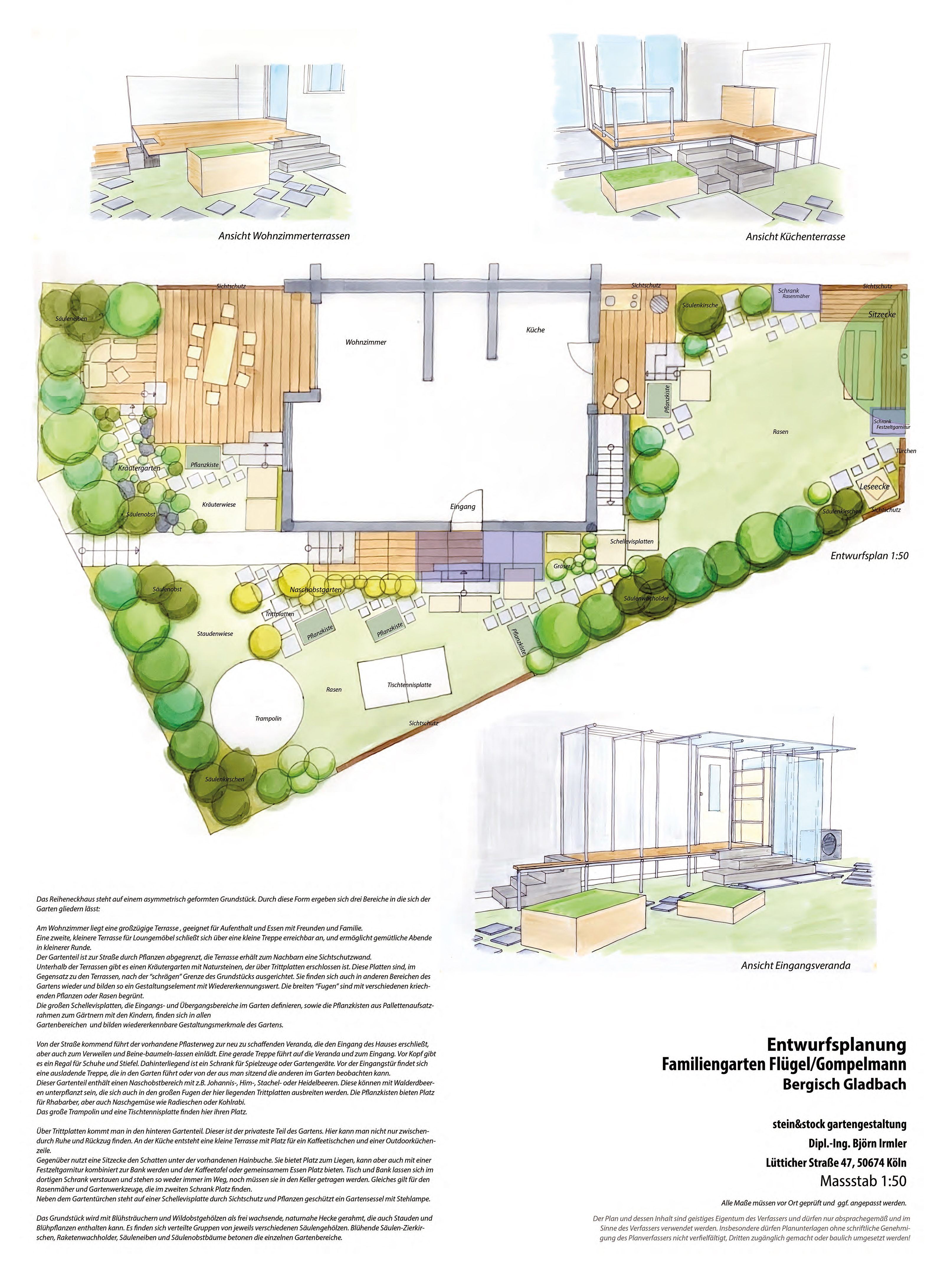 Das Reiheneckhaus steht auf einem asymmetrisch geformten Grundstück. Durch diese Form ergeben sich drei Bereiche in die sich der Garten gliedern lässt: Am Wohnzimmer liegt eine großzügige Terrasse, geeignet für Aufenthalt und Essen mit Freunden und Familie. Eine zweite, kleinere Terrasse für Loungemöbel schließt sich über eine kleine Treppe erreichbar an, und ermöglicht gemütliche Abende in kleinerer Runde. Der Gartenteil ist zur Straße durch Pflanzen abgegrenzt, die Terrasse erhält zum Nachbarn eine Sichtschutzwand. Unterhalb der Terrassen gibt es einen Kräutergarten mit Natursteinen, der über Trittplatten erschlossen ist. Diese Platten sind, im Gegensatz zu den Terrassen, nach der "schrägen" Grenze des Grundstücks ausgerichtet. Sie finden sich auch in anderen Bereichen des Gartens wieder und bilden so ein Gestaltungselement mit Wiedererkennungswert. Die breiten "Fugen" sind mit verschiedenen kriechenden Pflanzen oder Rasen begrünt. Die großen Schellevisplatten, die Eingangs- und Obergangsbereiche im Garten definieren, sowie die Pflanzkisten aus Pallettenaufsatzrahmen zum Gärtnern mit den Kindern, finden sich in allen Gartenbereichen und bilden wiedererkennbare Gestaltungsmerkmale des Gartens.
